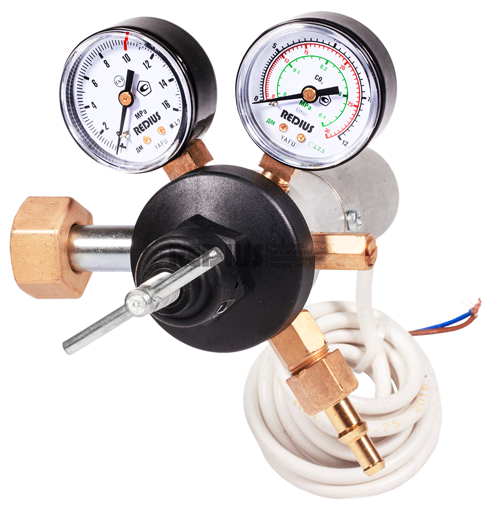 Регулятор расхода баллонный одноступенчатый предназначен для понижения и регулирования давления углекислого газа, поступающего из баллона, и автоматического поддержания постоянного рабочего расхода газа на выходе регулятора в ходе проведения работ. Подогреватель используется для предотвращения замерзания механизмов редуктора при больших расходах газа или при низких температурах окружающей среды. Подогрев осуществляется за счет теплообмена между газом и горячими стенками корпуса подогревателя.